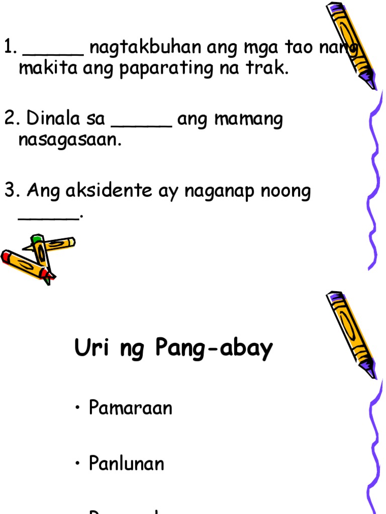 Mahalaga rin ang mga pang-abay sa pagpapahayag ng mga bagay na may kinalaman sa oras. Pang-abay na kusatibo- nagsasaad ng dahilan sa pagganap ng kilos. Ito ay tinatanag ang kaalamang bayan na binubuo ng mga salawikain sawikain bugtong palaisipan kasabihan at bulong.