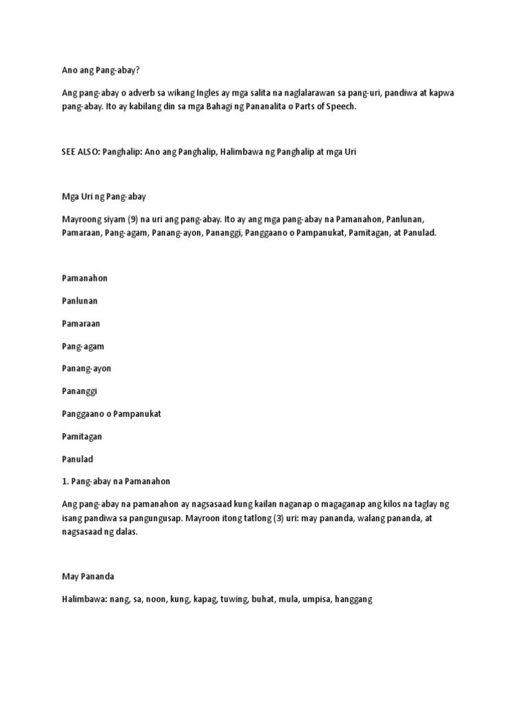 Examples of pang-abay na panang-ayon are listed below. Ang pang-abay o tinatawag na adverb sa ingles ay bahagi ng panalitang nagbibigay turing sa pandiwa pang-uri at kapwa pang-abay. Pamanahon - pang-abay na nagsasaad kung kalian ginanap ginaganap o gaganapin ang sinasabi ng pandiwa sa pangungusap.