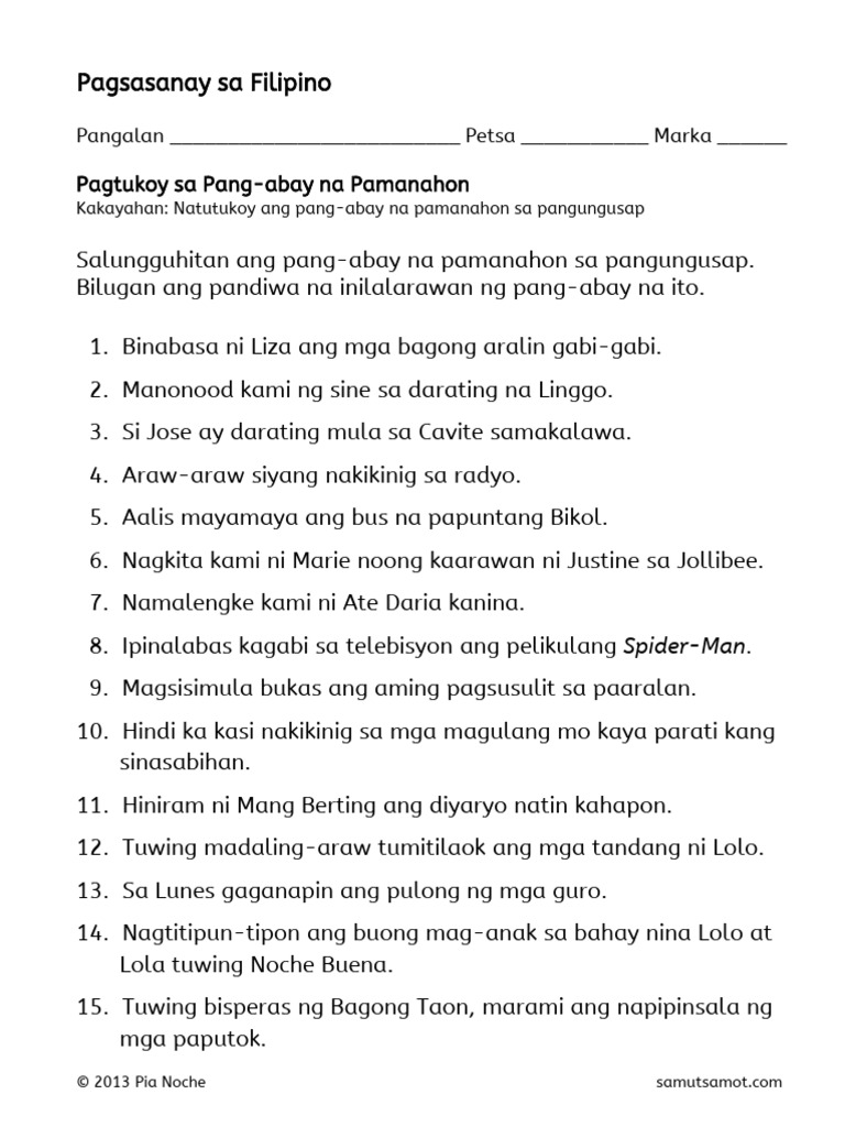 Pagmamalaki sa kulturang pinoy ay pagiging Pilipino. Pang-abay na Panlunan - ay nagsasaad ng lugar na pinangyarihan ng kilos o pangyayari. Each worksheet has 15 items.