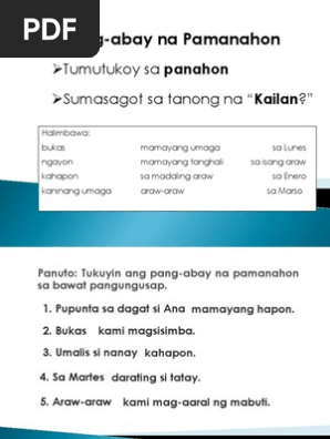 Pang abay na pamaraan soft copy. Worksheets are Adverb of manner work for grade 2 Pagsasanay sa filipino Pang abay na pamaraan1 Pagsasanay sa filipino Kundisyunal na pang abay work Gamit ang pang abay Talata may pang uri Talata may pang uri. Contextual translation of pana abay na pamaraan into English. Contextual translation of alamat ng cebu pang abay na pamanahon into English.